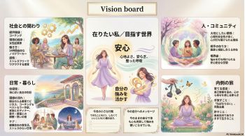 NotebookLMのインフォグラフィックモードまたはGemini(Nano Banana Pro)の思考モードで未来ビジョンボード生成可能。